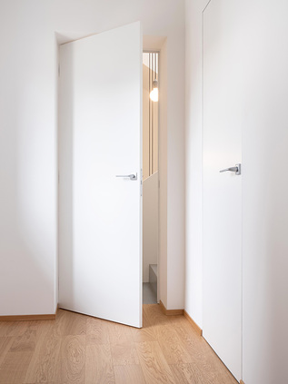 Tutto il piano terra è destinato alla zona giorno. Un porta a scomparsa a doppia anta conduce ad un’area più riservata, adibita a studio. La porta a battente a lato invece conduce ad un piccolo bagno. In entrambi i casi, quando i pannelli porta sono chiusi, lungo tutta la parete si crea una perfetta continuità visiva, completamente priva di sporgenze. Gli elementi utilizzati sono sostanzialmente tre: cemento, legno e soprattutto luce. Tra i materiali scelti, la resina è presente ovunque tranne che nelle camere dove è stato invece posato un parquet in rovere, mentre sulle pareti dei bagni è stato utilizzato un rivestimento in gres porcellanato effetto 3D.