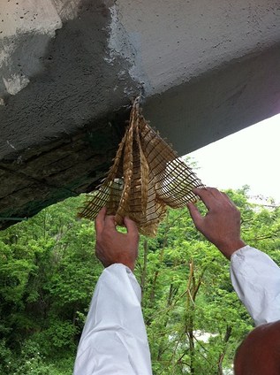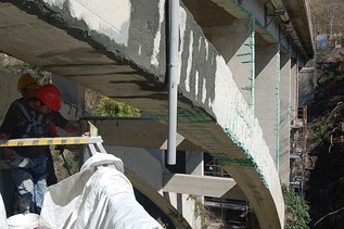 Prima di iniziare l'intervento di rinforzo strutturale vero e proprio si è proceduto con il ripristino della sezione resistente e del copriferro del pilastro del ponte: dopo l'eliminazione dell'intonaco e la demolizione delle parti incoerenti o in fase di avanzato degrado si è proceduto con la passivazione e il trattamento delle armature esistenti utilizzando il protettivo Rurecoat 3 di Ruredil, sgrassando e pulendo i ferri dalla ruggine, dalle incrostazioni di cls e, ove necessario, asportando completamento lo strato intaccato dalla corrosione. Si è poi proceduto con il ripristino delle parti mancanti o demolite con la malta strutturale fibrorinforzata Exocem FP di Ruredil. Successivamente si è proceduto con la pulitura del supporto mediante sabbiatura e depolverizzazione, oltre alla preparazione della superficie di posa della fibra mediante completa eliminazione delle asperità presenti. Il lavoro è proseguito con l'intervento di rinforzo strutturale, tramite: saturazione del sottofondo di posa della malta Ruregold MX Calcestruzzo; applicazione della malta Ruregold MX Calcestruzzo con fratazzo metallico liscio in spessore di 3-4 mm; annegamento della fibra Ruregold XP Calcestruzzo con orientamento definito dagli elaborati esecutivi; applicazione del secondo strato di Ruregold MX calcestruzzo con fratazzo metallico nello spessore di 3-4 mm, si è inoltre proceduto con la procedura “fresco su fresco” per gli strati successivi di rinforzo ove previsti. La linea Ruregold rappresenta la più evoluta tecnologia per il comparto dei rinforzi strutturali di supporti in muratura e calcestruzzo armato. Si tratta di un’innovativa soluzione brevettata costituita da una rete in fibre di PBO (poliparafenilenbenzobisoxazolo), disponibile in diversi formati idonei a vari tipi di applicazione, e da una matrice inorganica stabilizzata appositamente formulata per il nuovo sistema. Ruregold classificato come FRCM (Fiber Reinforced Cementitious Matrix), non utilizza resine epossidiche ma impiega un legante idraulico perfettamente compatibile sotto il profilo chimico, fisico e meccanico con il supporto su cui è applicato. Il sistema Ruregold è indicato per interventi di rinforzo di strutture in cls soggetti a pressoflessione, taglio come solai, travi e pilastri e per interventi su supporti in muratura, con funzioni di antiribaltamento, rinforzo strutturale e adeguamento sismico. La linea Ruregold è la prima linea FRCM al mondo conforme alla Norma Aci 549.