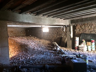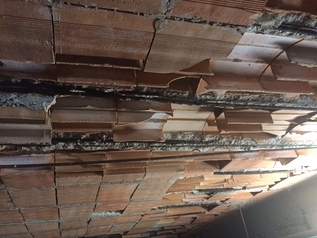 La mancanza di intonaco al soffitto, la mancata manutenzione e l’umidità del vano tecnico sono stati la causa principale del notevole degrado e conseguente sfondellamento esteso a quasi tutta la superficie. Fin da subito si è avuta la sensazione che la porzione con luce maggiore fosse in procinto di collassare e che la soluzione più idonea fosse la demolizione e la successiva ricostruzione.