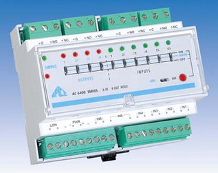 AC6400 - Nodo I/O multiuso: AC6400 è un dispositivo di I/O multiuso e basato su tecnologia LonWorks®. Possiede 4 uscite a relè che possono pilotare direttamente 1KW di carico resistivo a 220VAC oppure 750VA di carico reattivo come, ad esempio, i tubi fluorescenti. Può essere utilizzato per l’illuminotecnica o per l’automazione di uffici ed aree comuni.