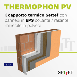 Successivamente è stato posato il cappotto termico Settef Thermophon PV, dotato di pannelli isolanti in EPS bianchi o grigi (additivati di grafite) e con collante/rasante minerale in polvere.